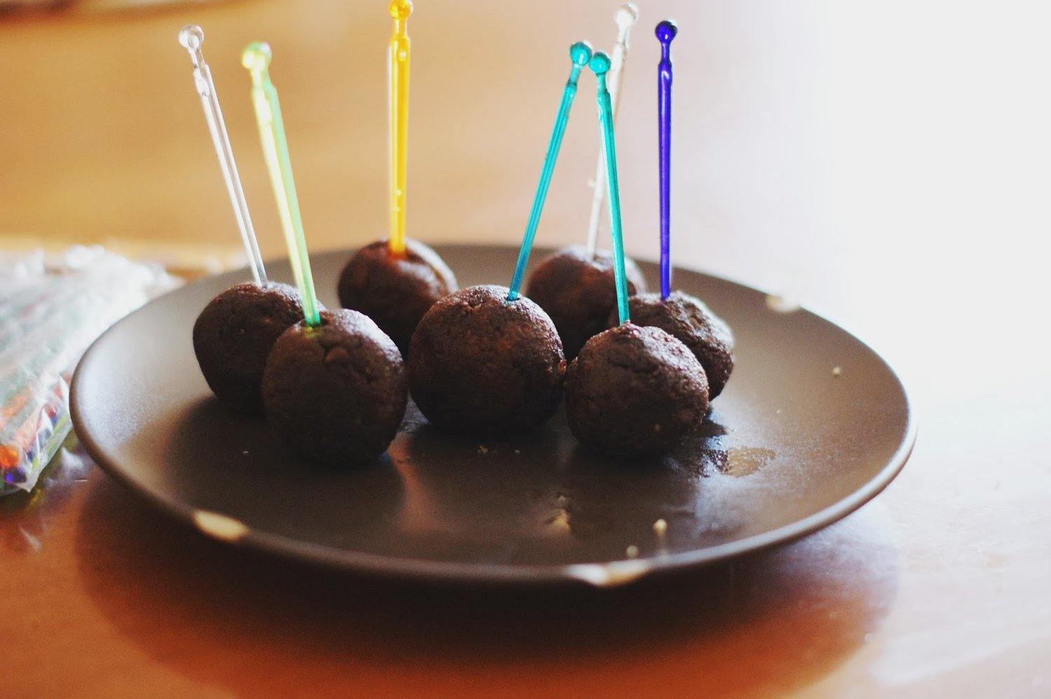 Tritate in un robot da cucina le mandorle spellate. Per spellarle con facilità basta lasciarle in un pentolino con abbondante acqua per qualche ora. Quando la farina di mandorle sarà pronta (non è necessario che le mandorle siano tritate finemente, ma vanno bene dei pezzi più grossi) aggiungete i fiocchi di avena e tritate per qualche altro secondo. Mettete il composto in un piatto e aggiungete il resto degli ingredienti, quindi impastate con le mani. Componete delle palline da infilzare con un bastoncino da cake pops, se ne siete provvisti (potete anche non utilizzarlo e consumare le palline senza di esso) Intingete le palline nel cioccolato fuso o nella ganache al cioccolato (ricetta dopo le foto) e mettete in frigo finché il cioccolato non sarà solido.