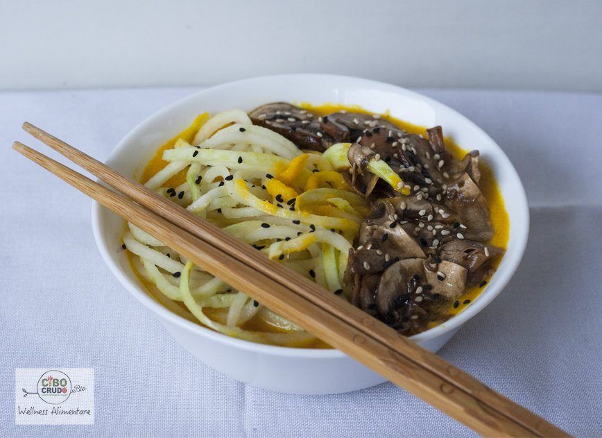 PROCEDIMENTO Preparo prima gli spaghetti di cavolo rapa con lo Spiromat, li metto in una terrina, verso sopra olio e limone e li lascio marinare per 30 minuti. Ora preparo la crema di miso dolce, mettendo tutti gli ingredienti nel boccale del frullatore ad immersione. Frullo bene fino ad ottenere una crema liscia, e tutti gli ingredienti si saranno ben amalgamati. La metto poi in un contenitore ermetico e la conservo in frigorifero. Per dare sapore alla zuppa preparo la crema di miso dolce; taglio le albicocche essiccate a pezzetti, e le metto nel boccale del frullatore ad immersione, aggiungo ora il miso e gli altri ingredienti, e frullo fino ad ottenere una crema densa e corposa. Se fosse troppo densa, aggiungo altra acqua. Per la crema di zucca metto tutti gli ingredienti nel boccale del Frullatore (Vitamix) e frullo fino ad ottenere una crema liscia ed omogenea, e la metto da parte. Mentre per preparate i funghi marinati, pulisco bene i funghi e con una mandolina li taglio molto sottilmente, li metto poi in una terrina e li condisco con la soia, il limone e li lascio marinare per 20 minuti. Passato il tempo di marinatura, posso preparare il piatto. Metto prima la zuppa di zucca, poi gli spaghetti, i funghi marinati e decoro con semi di nigella e di sesamo.