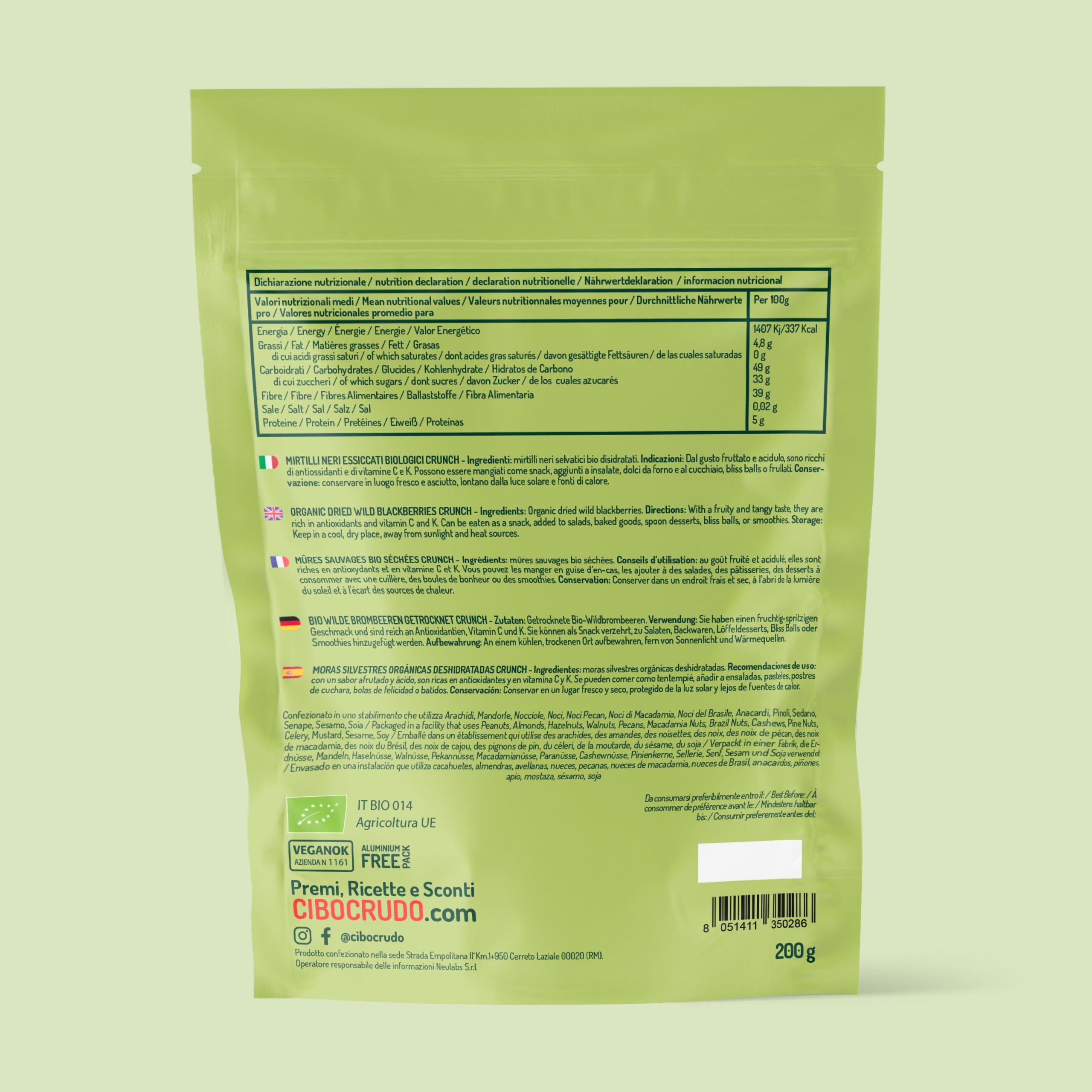 I mirtilli neri disidratati in vendita su CiboCrudo sono mirtilli selvatici provenienti da terre incontaminate e garantite dalla certificazione biologica. Vengono raccolti a mano e fatti essiccare delicatamentesenza aggiungere alcun additivo, né zucchero. Sono deliziosi, sani, ricchi di nutrienti benefici e compatibili con uno stile di vita attento al benessere e all’ambiente.
